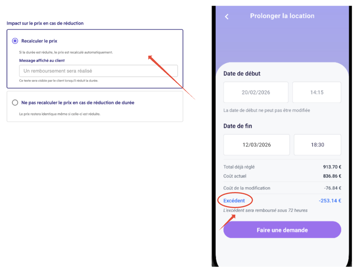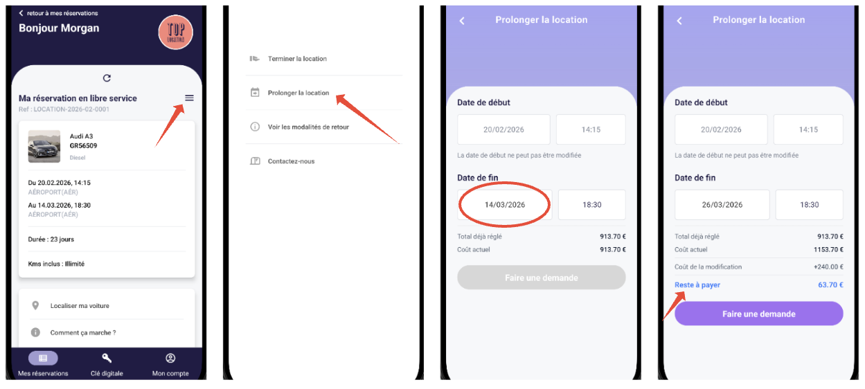 En cas de prolongation, le reste à payer évolu. Le client doit alors cliquer sur "faire une demande" et régler le reste à payer.